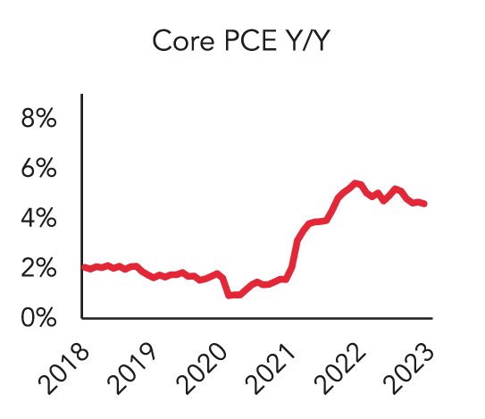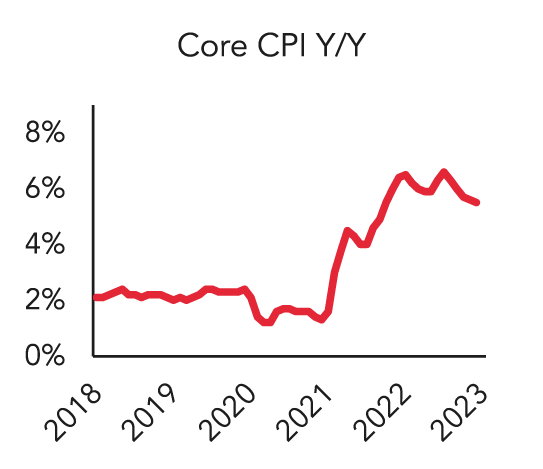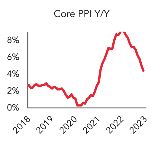 Inflation continued to soften, both relative to recent highs as well as relative to market expectations. The Core (excluding food and energy) Consumer Price Index (CPI) increased by 5.5% year-over-year (y/y)1, a continued decline relative to last September’s high of 6.6%. Other measures of inflation (which tend to lead CPI) moderated as well. The Core Producer Price Index (PPI) increased by 4.4% y/y1, and the Core Personal Consumption Expenditures (PCE) Deflator increased by 4.6% y/y2.