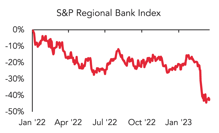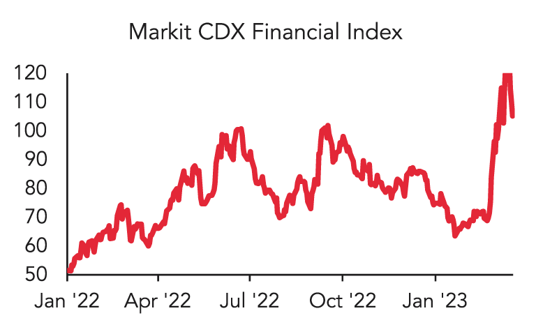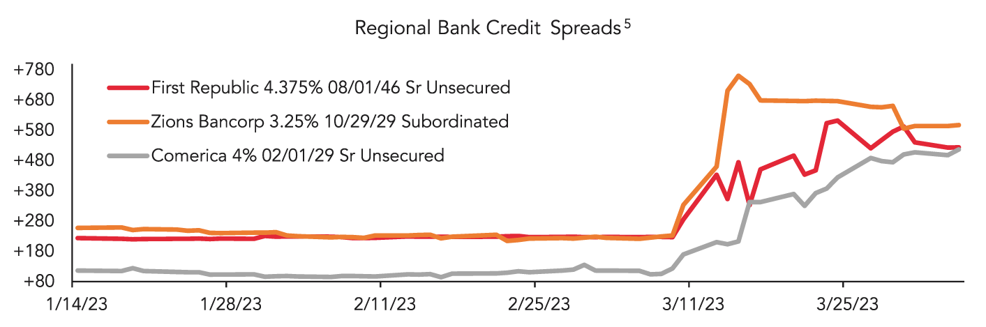 Other regional banks also saw elevated deposit withdrawals. Liquidity concerns lead investors to sell regional bank debt, resulting in credit spreads (the additional yield that investors demand versus a risk-free bond) widening to the highest levels since the 2008 financial crisis4.